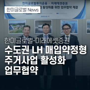 ▲ 사업 발굴부터 금융 조달, 책임준공까지 토털 솔루션(TSP) 제공 국내 1위 PM(건설사업관리) 전문기업 한미글로벌(회장 김종훈)은 투자운용 자회사 한미글로벌투자운용(대표 김영근)과 건설 자회사 한미글로벌이엔씨(대표 박철)가 미래에셋증권(IB2부문 대표 김정수)과 11일 서울 강남구 삼성동 한미글로벌 본사에서 LH(한국토지주택공사) 매입약정형 주거사업 활성화를 위한 업무협약을 체결했다고 밝혔다. LH 매입약정형 주거사업은 민간이 건설하는 주택을 LH가 준공 전 사전 약정으로 매입해 공공임대로 공급하는 주택공급 모델이다. 설계 단계부터 공공과 민간이 협력해 품질을 보증하고, 준공 후 LH가 전량 매입하는 구조로 사업자의 분.......